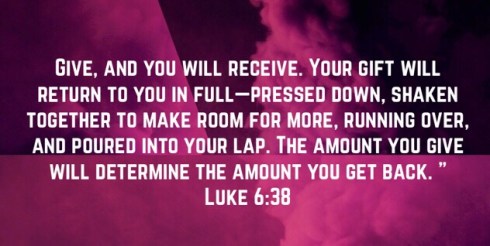 In nearly every sermon or article on giving and/or money i’ve heard, this verse or it’s OT counterpart has been mentioned. Maybe it’s time we broaden our giving horizons! We live in a society in which negativity, lack of hope and loneliness are rampant. The principle of this verse goes far beyond the almighty dollar! To have a friend, be a friend; to be heard, listen to others; to be accepted when your beliefs may be different than others, accept others right to be ‘wrong’; to be loved unconditionally, love unconditionally; to receive patience, be patient. Don’t wait for others. Be the start of something great in your life! Receiving starts with giving.