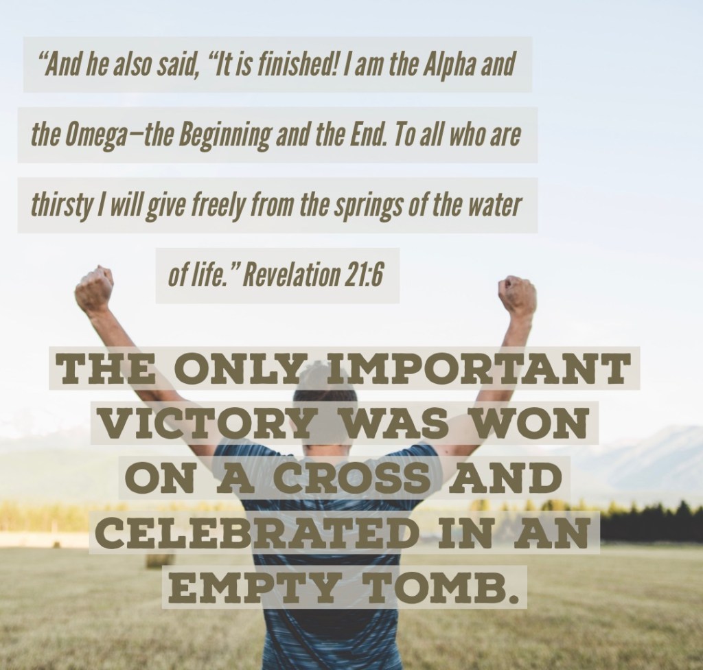 “It is finished.” Those words bring a variety of emotions. If you’ve been working on a project it brings the satisfaction of victory over all the frustrations it took to get to the point where all your efforts see a great result. Sometimes, the phrase “It is finished” can bring pain and anguish, such as when a relationship ends, a career suddenly is taken from you or a loved one passes away. But when Jesus says “It is finished”, it says completeness. All the sorrows you’ve endured? Relief! All the fear and anxiety you harbor? Comfort! The pain of broken relationships? Healed! The frustration of addiction? Release! You’re anger over unfair treatment? Satisfied! The result is like a cool fountain of spring water that cools, refreshes, satisfies and strengthens. One day our victory will be revealed because in Jesus it is already finished!