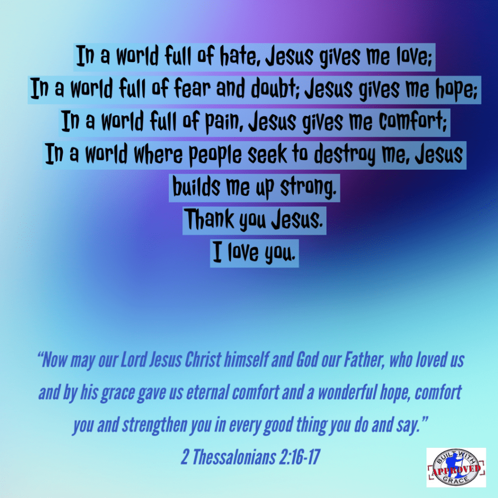 August 27, 2022 in Uncategorized | Tags: 2 Thessalonians 2:16-17, Built with Grace, forgiveness, God, God's love, grace, Grace Nuggets, Holy Bible, Holy Spirit, Jesus, Jesus Christ, love, prayer, trust | 1 comment