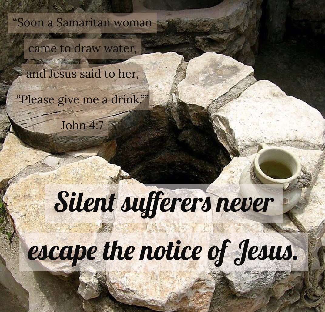 He does the same today. You don’t need to suffer in silence. He wants to hear from you. He wants us to see those who may be suffering and offer the fresh water of his grace. Silent sufferers never escape the notice of Jesus.