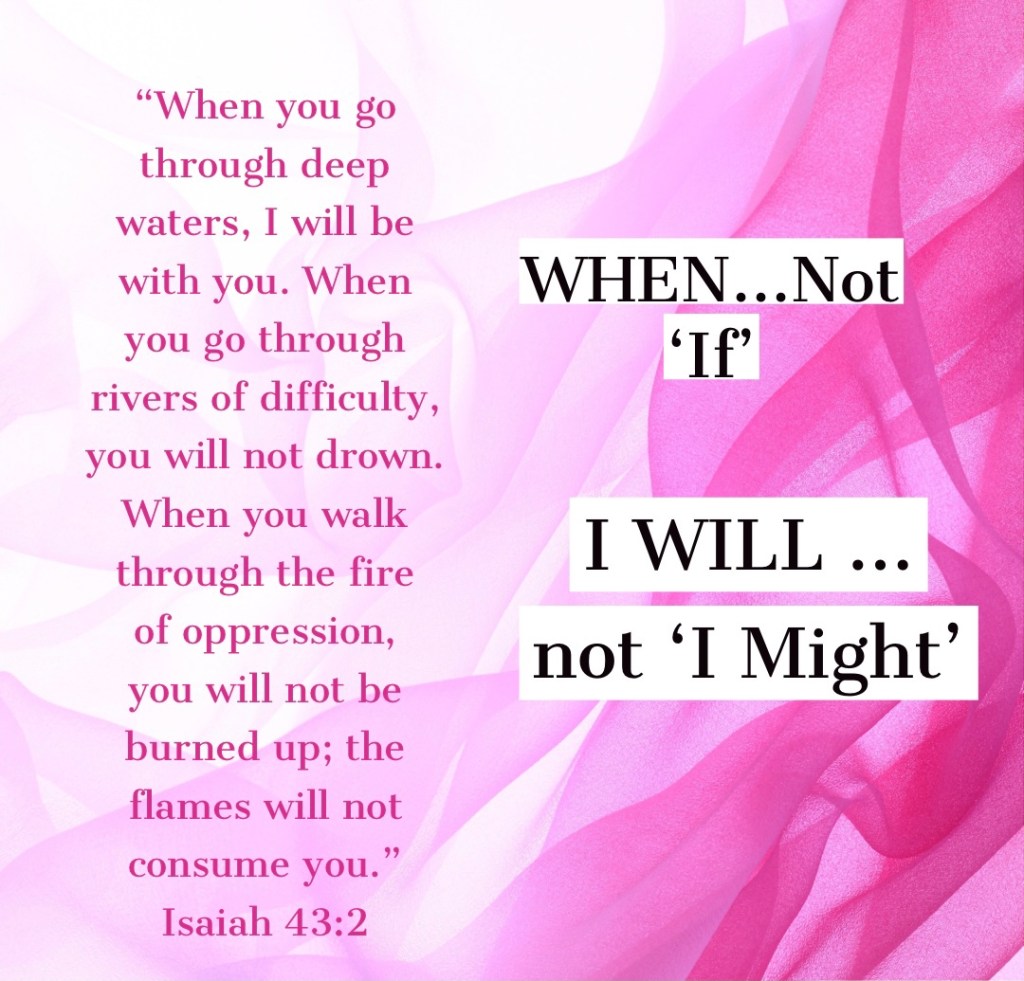 You may have done something terribly wrong. You may be feeling guilt right now for mistakes of your past. You may even be living with life-long consequences for what you did years ago. Remember that even though you may be living in the consequences of sin God has forgiven you. He promises to protect and comfort even during those times. Living in the consequences of sin doesn’t mean you aren’t forgiven. Notice the verse for today. The words are not “If you walk through deep waters, but when. You will suffer struggles. You will have things to endure. You will feel distant from God from time to time. That doesn’t change the fact that he is there for you.